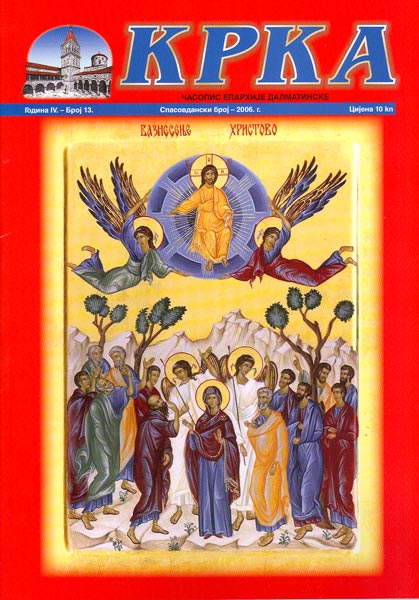 ČASOPIS EPARHIJE DALMATINSKE "KRKA" br. 13 SADRŽAJ: Pokajanje; Slava bogoslovije u manastiru Krka; Vaseljenski učitelji; INTERVJU: Episkop dalmatinski G.G. Fotije za „Slobodnu Dalmaciju"; Inventar pravoslavnog manastira i crkve sv. Petke (Venerande) u Hvaru s kraja XVIII vijeka; Dr Božidar Petranović; Vijesti iz Eparhije; Apel crkvene opštine Pađane; Priložnici časopisa Krka. IZDVAJAMO IZ SADRŽAJA: dr Božidar Petranović Nad grobom ovog neumornog radnika i zaslužnog Šibenčanina stoji spomenik sa kratkim, ali sadržajnim natpisom: srpskom naučenjaku žarkom rodoljubu dru Božidaru Petranoviću narod p(odiže) MDCCCLXXIV